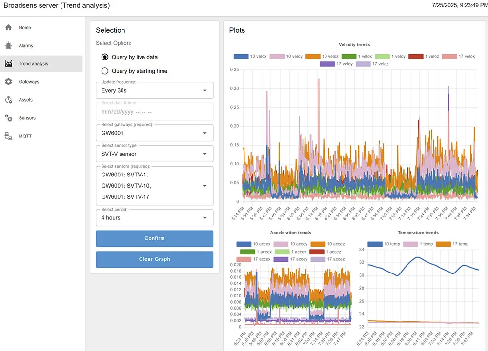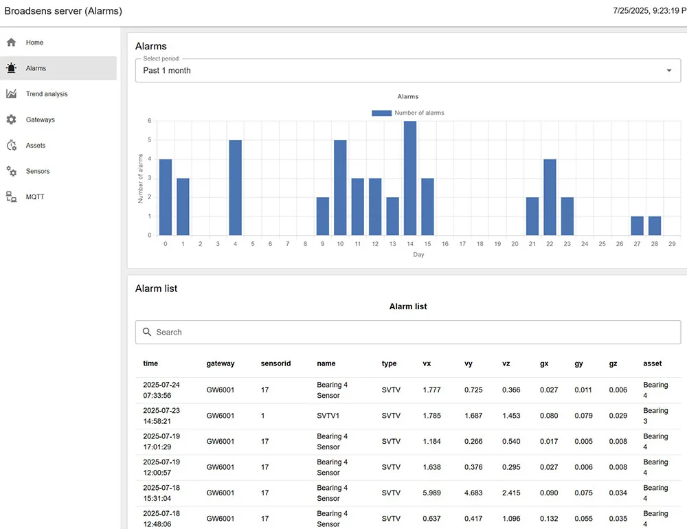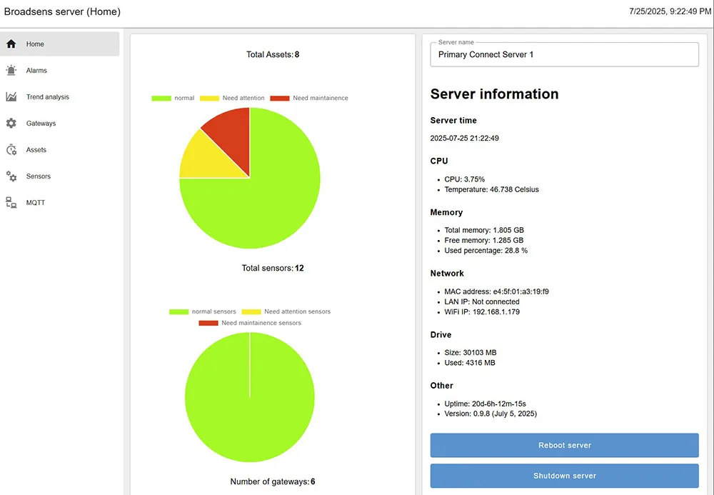 BroadView 服务器软件支持多个 Broadsens 边缘计算网关和传感器,如无线振动和温度传感器。来自不同网关的传感器数据会被汇总并保存在同一服务器中,便于分析。BroadView 服务器软件可以托管在云平台上,也可以托管在本地服务器上。托管在云端时,只要有互联网接入,用户可以访问世界任何地方的数据。在本地托管时,服务器在组织自身的物理设施内管理,无需互联网接入,以确保最大安全性。